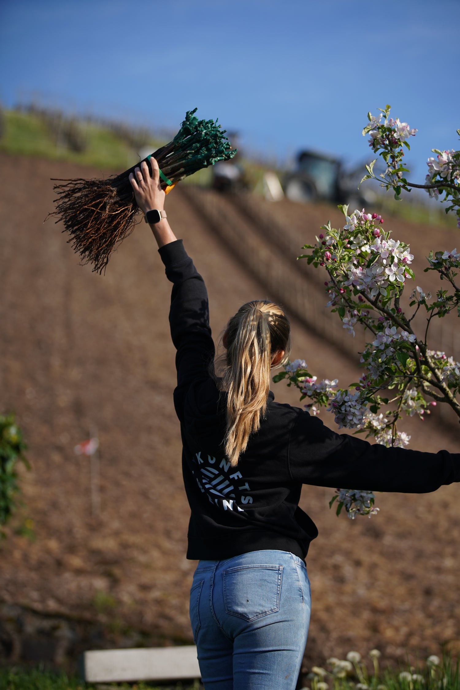 Zur Förderung der Artenvielfalt verzichten wir auf Herbizide. Stattdessen führen wir mechanische Unterstockbehandlungen durch oder legen auch mal mit der Hacke im Steilhang selbst Hand an.